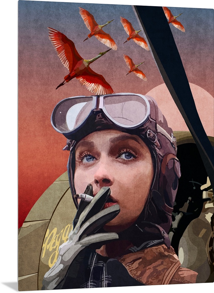 <p>A retro style illustration of a female aviator smoking a cigarette in front of a vintage aircraft with a flock of flamingoes flying overhead.</p>