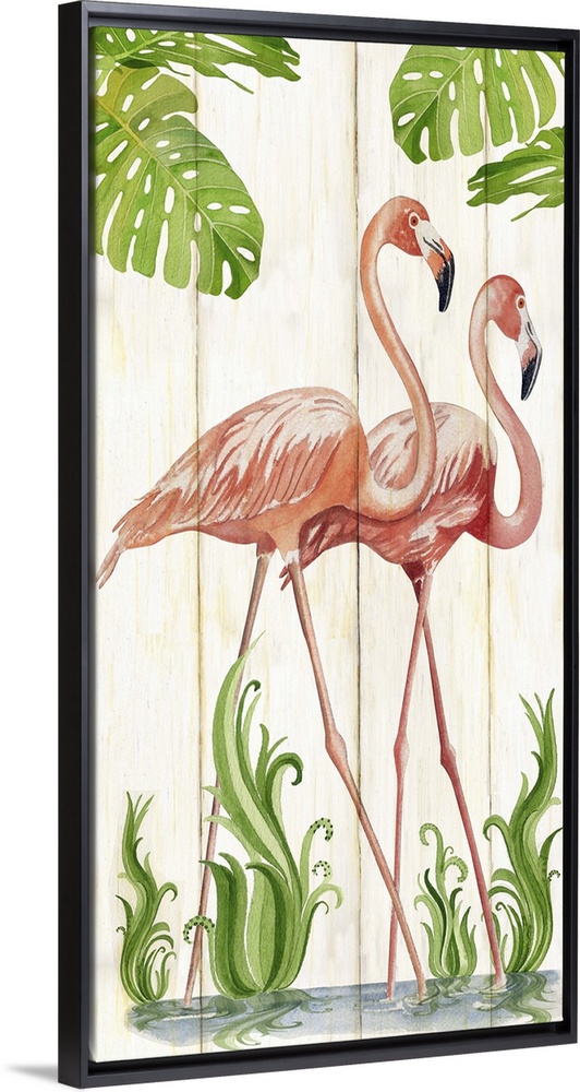 <p>Contemporary watercolor coastal artwork of two flamingos standing side by side.</p>