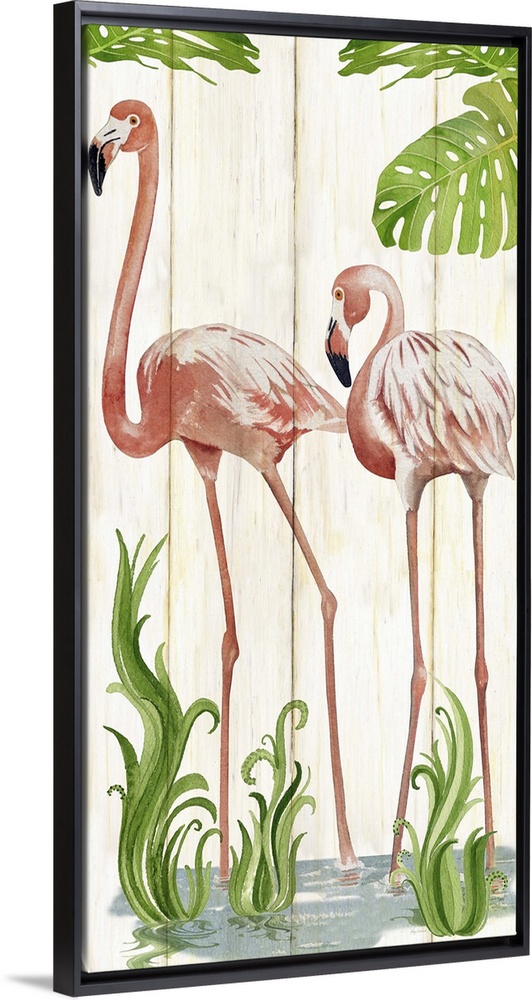 <p>Contemporary watercolor coastal artwork of two flamingos standing side by side.</p>