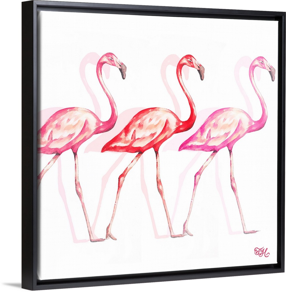 <p>Square art of three flamingos in different shades of pink walking behind each other with light shadows in the background.</p>