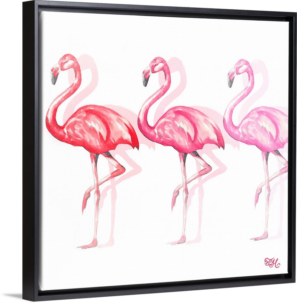 <p>Square art of three flamingos in different shades of pink walking behind each other with light shadows in the background.</p>