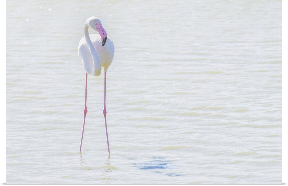 <p>Flamingo wading in shallow water, processed in high key lighting, Sainte Marie de la Mer, France</p>