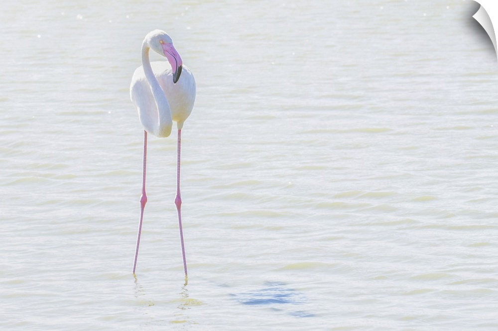 <p>Flamingo wading in shallow water, processed in high key lighting, Sainte Marie de la Mer, France</p>