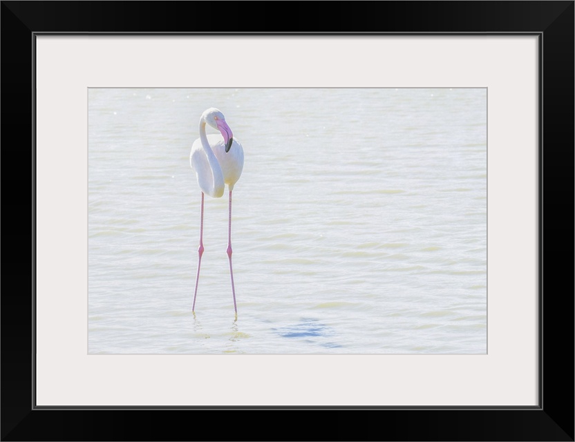 <p>Flamingo wading in shallow water, processed in high key lighting, Sainte Marie de la Mer, France</p>