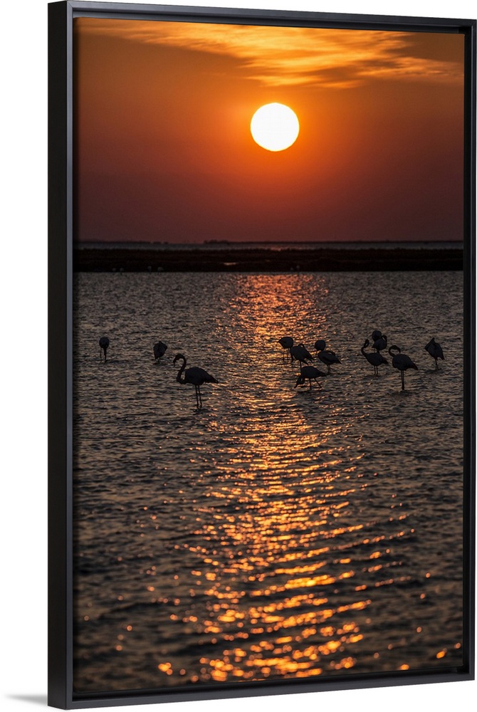 <p>Flamingos in silhouette on the water at sunset</p>