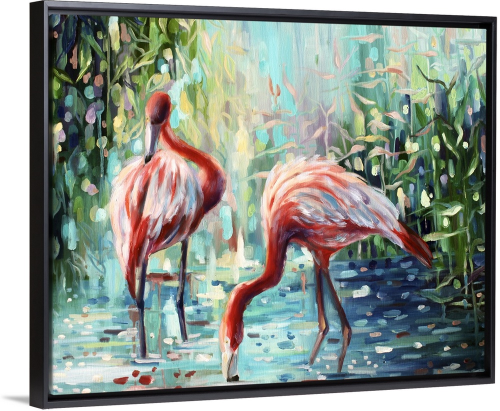<p>Contemporary painting of flamingos standing in shallow jungle waters.</p>