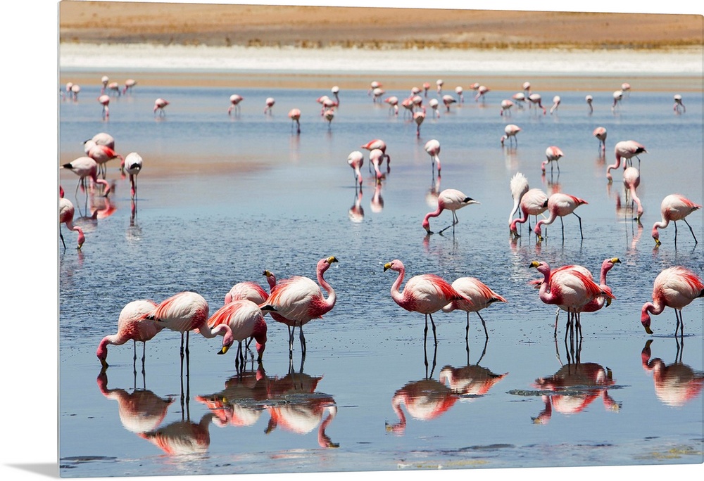 <p>Flamingos feeding at a lagoon in Bolivia's southwest altiplano.</p>