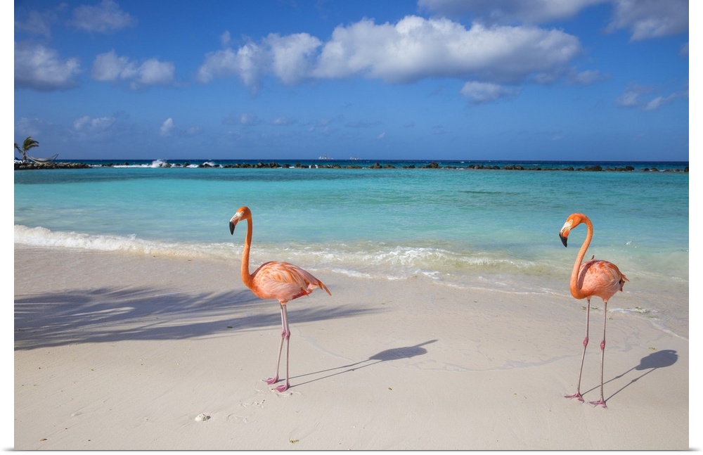 <p>Flamingos on Flamingo beach, Renaissance Island, Oranjestad, Aruba, Lesser Antilles, Netherlands Antilles, Caribbean, Central America</p>