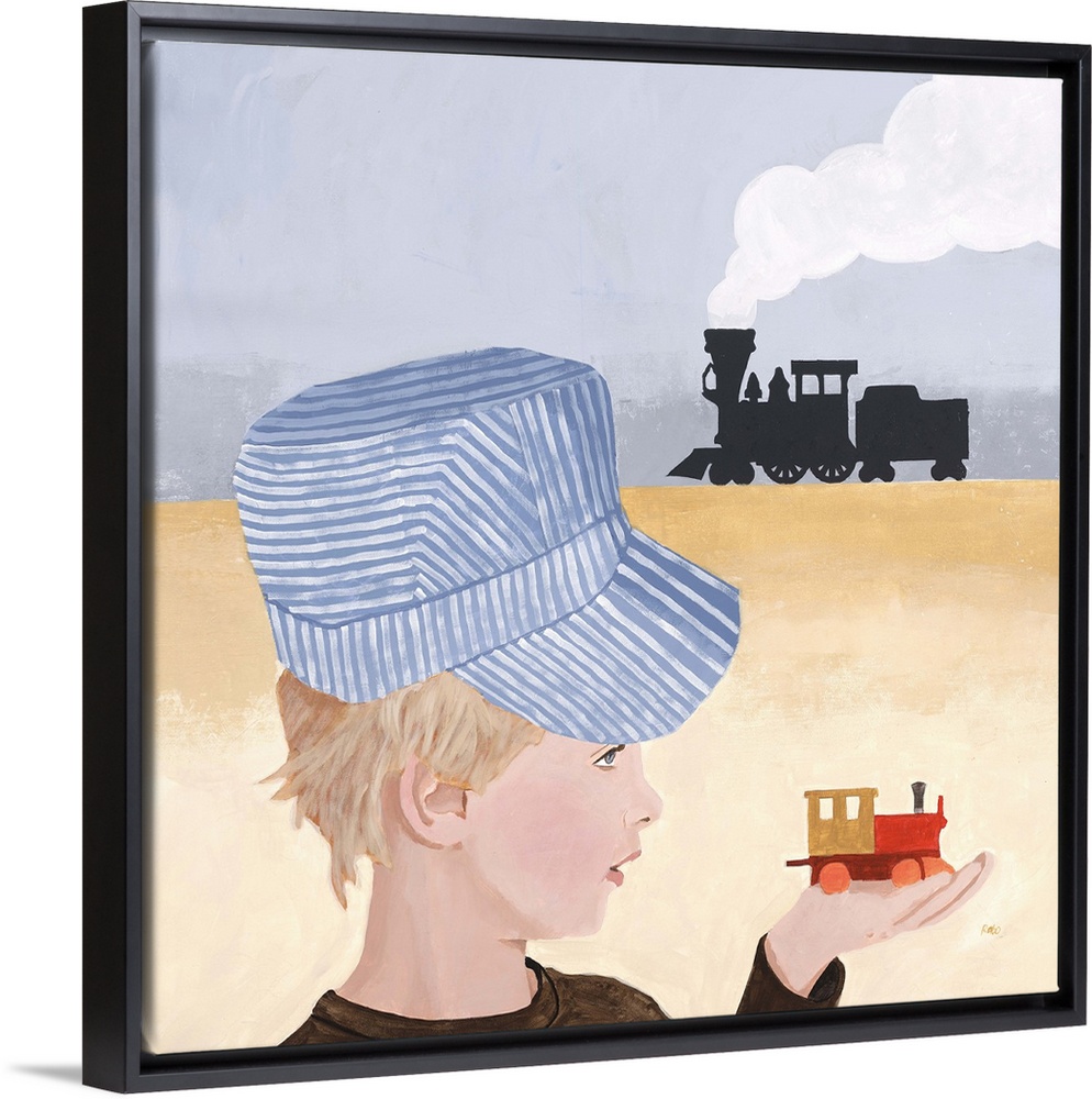 <p>Contemporary painting of a young boy holding a toy train, with another train in the distance.</p>