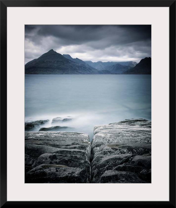 <p>Looking across the sea to the Isle of Skye with mountains under a grey sky</p>