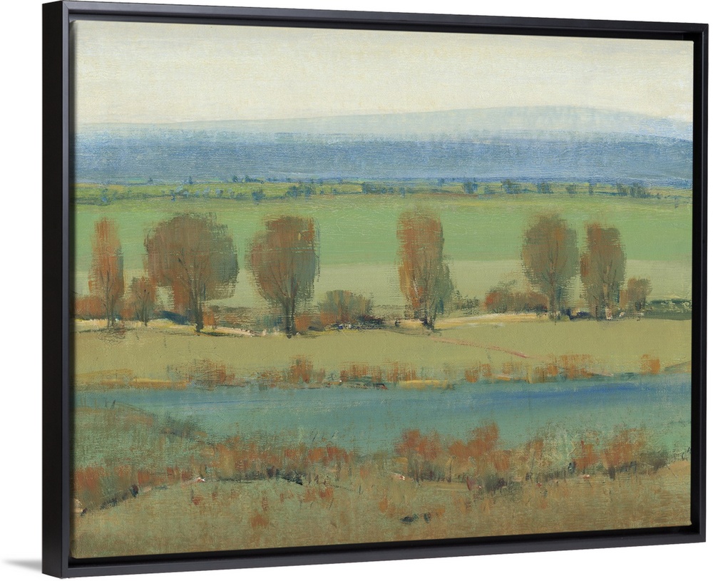<p>Horizontal brush strokes create this contemporary artwork of a relaxing countryside.</p>