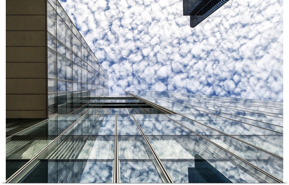 <p>The glass facade of a skyscraper in Brussels reflecting the clouds in the sky.</p>