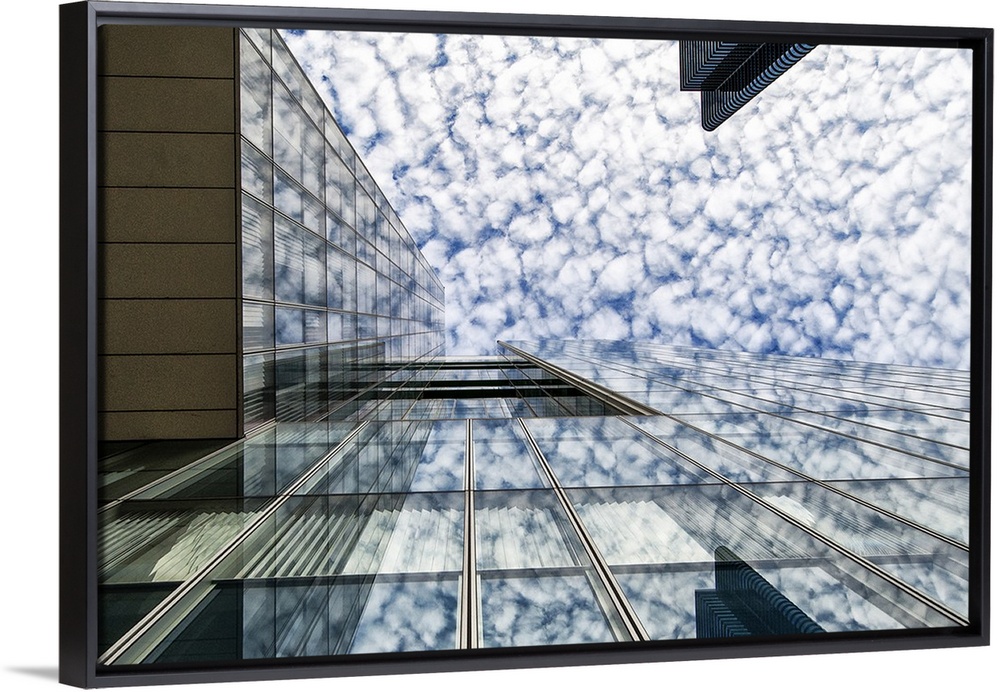 <p>The glass facade of a skyscraper in Brussels reflecting the clouds in the sky.</p>