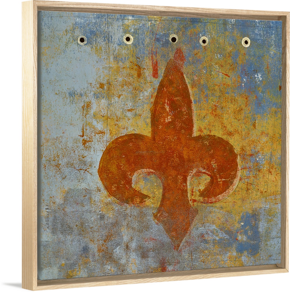 <p>Square abstract painting of a sienna orange fleur de lis on a blue, grey, and yellow background.</p>