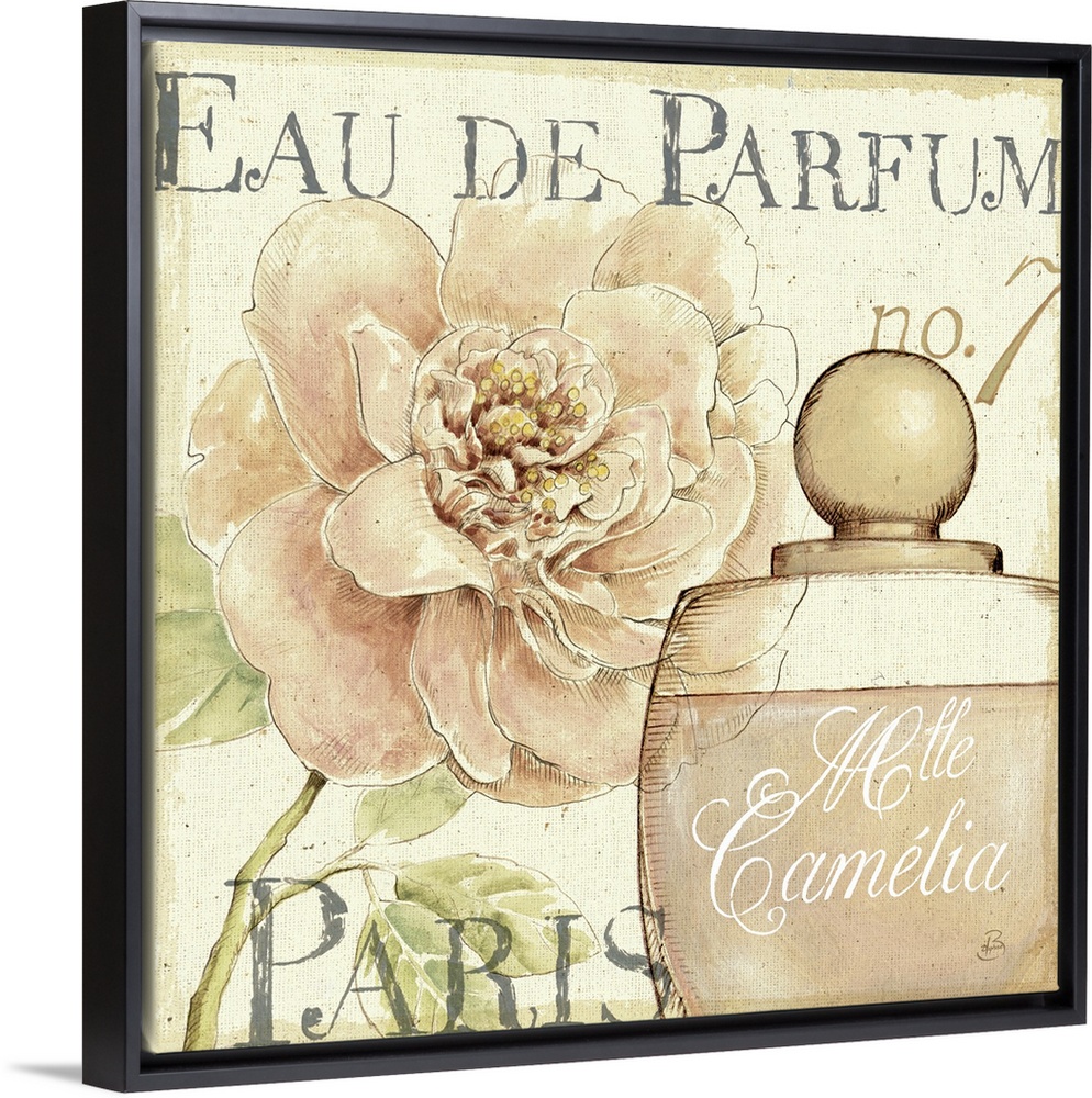 <p>Decorative drawing of a perfume bottle from Paris with a large pink peony flower blooming in the background.</p>