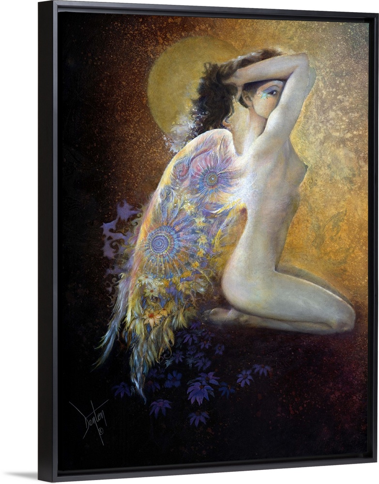 <p>A contemporary painting of a fairy with brightly colored elaborate wings sitting and gazing at the viewer through the closure of her arm as she holds her hair.</p>