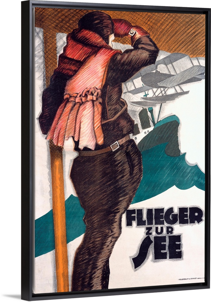 <p>A man is looking at plane and a ship. For what would appear to be a wartime film in praise of military might, Erdt gives us this sweeping 2-sheet design focusing on the swashbuckling nature rather than the destructive aspects of the life of a Sea Flyer. At the time, naval biplanes were catapulted from the ships deck in order to scout the skies surrounding the fleet. As no landing gear was available to the planes, they would set down in the water to be recovered by specially built cranes. No record of the film exists however in German film chronicles which leads us to believe that is must have been an import whose name altered to suit Germanic consumers. Although he only lived to age 35. Erdt amassed an impressive record as a graphic artist and lithographer in the single decade from 1908 to1918, he depicted upper-class people in their sports and luxuries, and had a keen eye for reducing a scene to a few essential forms and flat colors. This unsigned work is generally attributed to Erdt.</p>