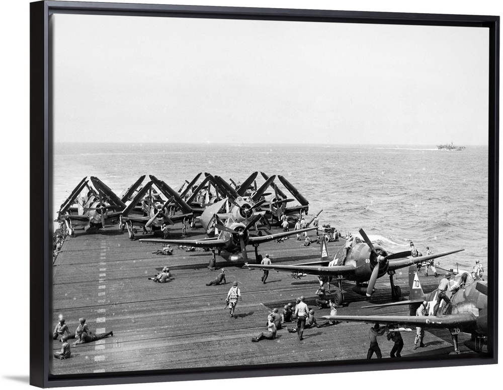 <p>American crewmen preparing airplanes for launch from the flight deck of the aircraft carrier USS Enterprise. Photograph, c1944.</p>