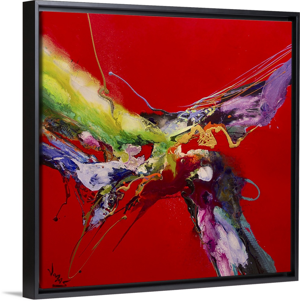 <p>Contemporary abstract painting using splashes of wild and vivid colors against a stark red background.</p>