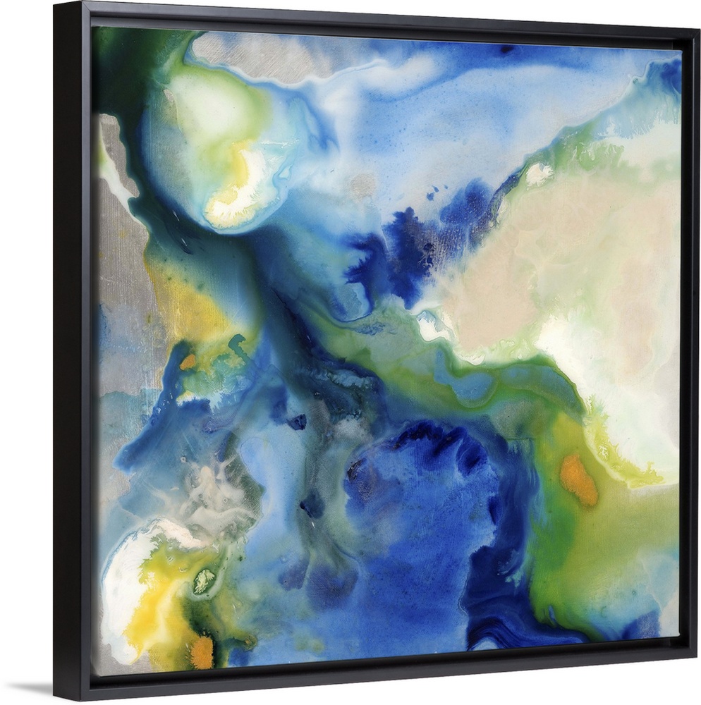 <p>Contemporary abstract painting of saturated blue and green tones in a swirling motion.</p>