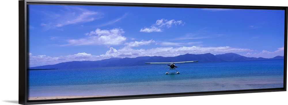 <p>Private propeller plane floating on the water near the shoreline with low mountains and cloudy skies overhead.</p>