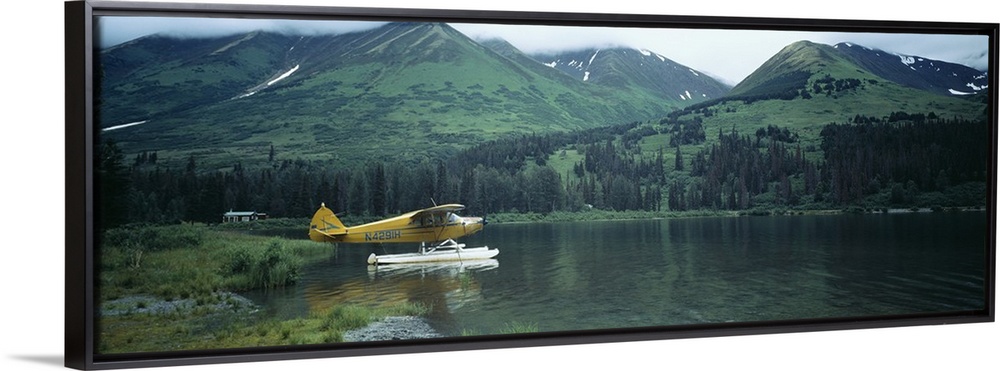 <p>Panoramic photograph of airplane on skis in lake with mountains in the distance.</p>