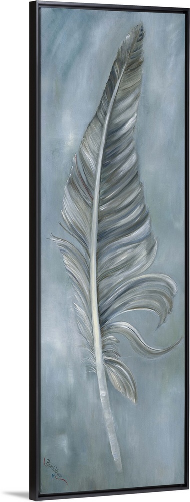 <p>Contemporary painting of a long wispy feather in blue and silver tones.</p>