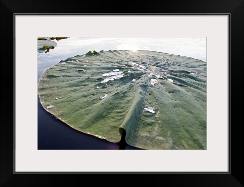 <p>Floating leaf and water drops. Lotus leaf: Nelumbio speciosum.</p>