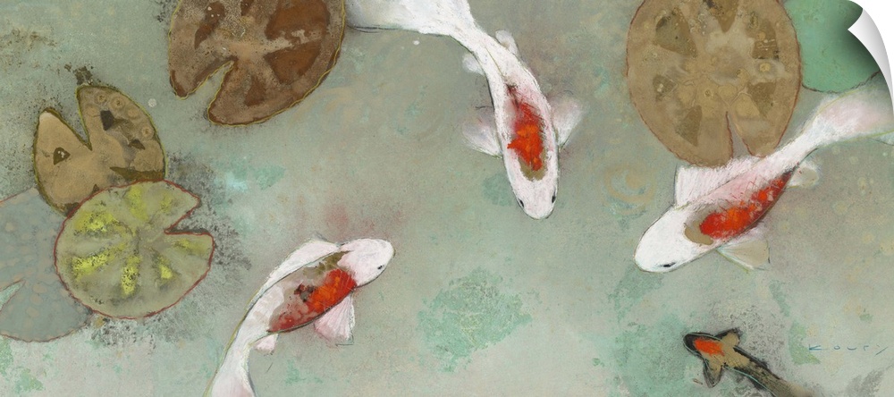 <p>Contemporary painting of white and orange koi swimming amid lily pads in a shallow pond.</p>