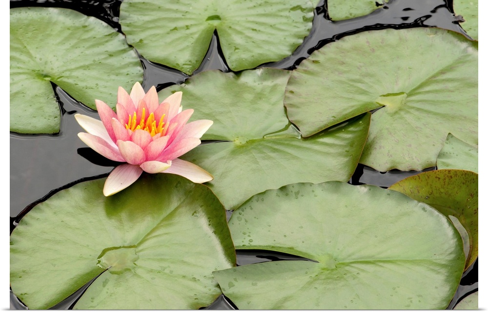 <p>Floating water lily flower and lily pads, Nymphaea species.</p>