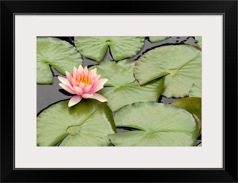 <p>Floating water lily flower and lily pads, Nymphaea species.</p>