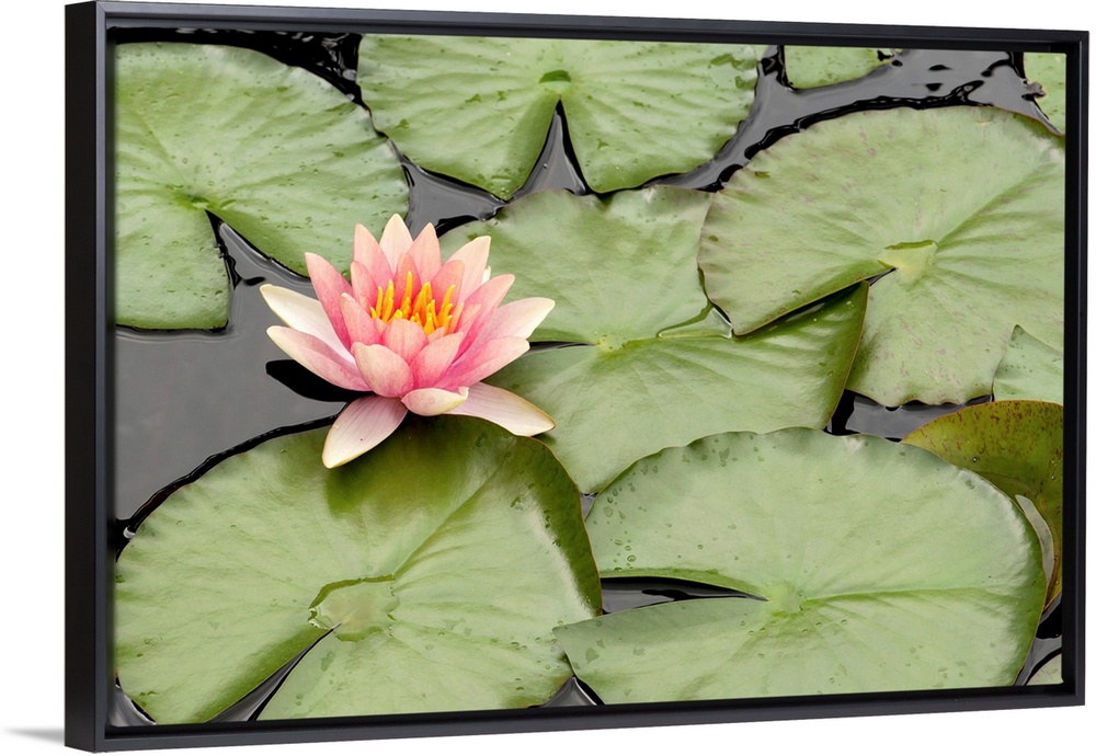 <p>Floating water lily flower and lily pads, Nymphaea species.</p>
