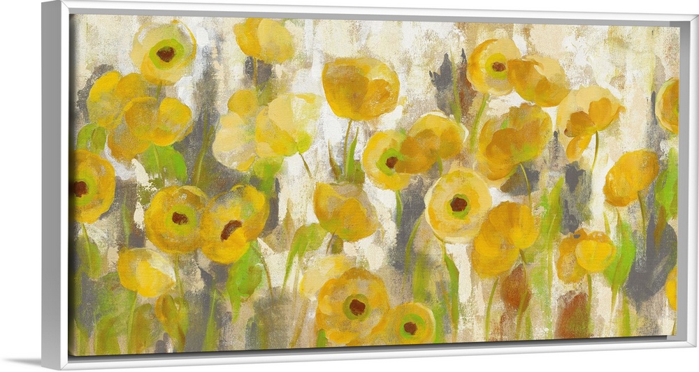 <p>Contemporary artwork of several golden flowers in a garden.</p>