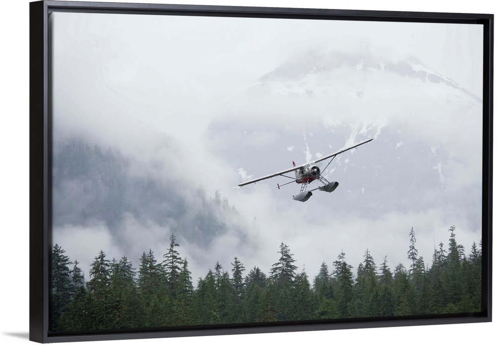 <p>Floatplane banks while flying low over coastal rainforest along Rudyerd Bay on flightseeing tour on foggy morning.</p>