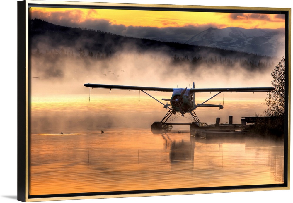 <p>Giant photograph displays a seaplane sitting next to a dock as a soft fog rolls over the water. In the background, the faint appearance of snow covered mountains can be seen.</p>