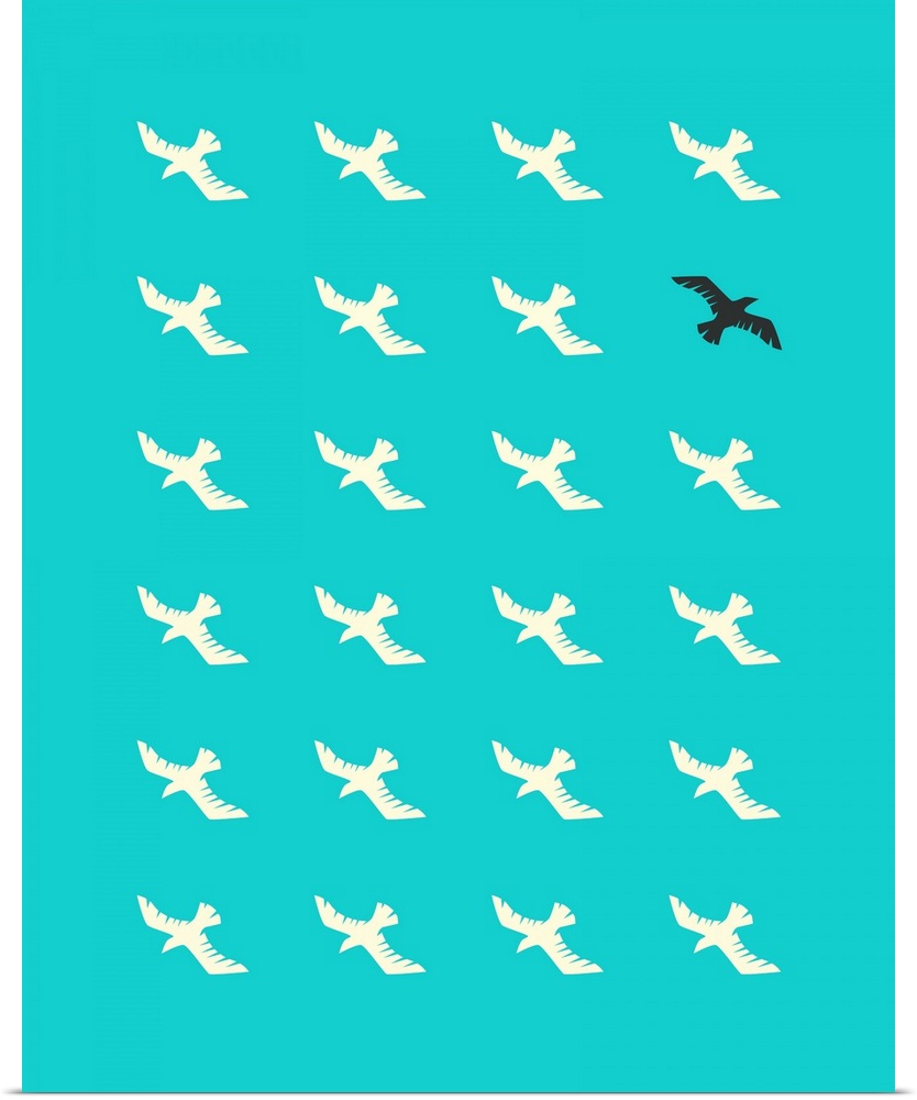 <p>Illustration of a flock of white birds flying down towards the bottom left corner, and one black bird flying up towards the top right corner, on a bright blue background.</p>