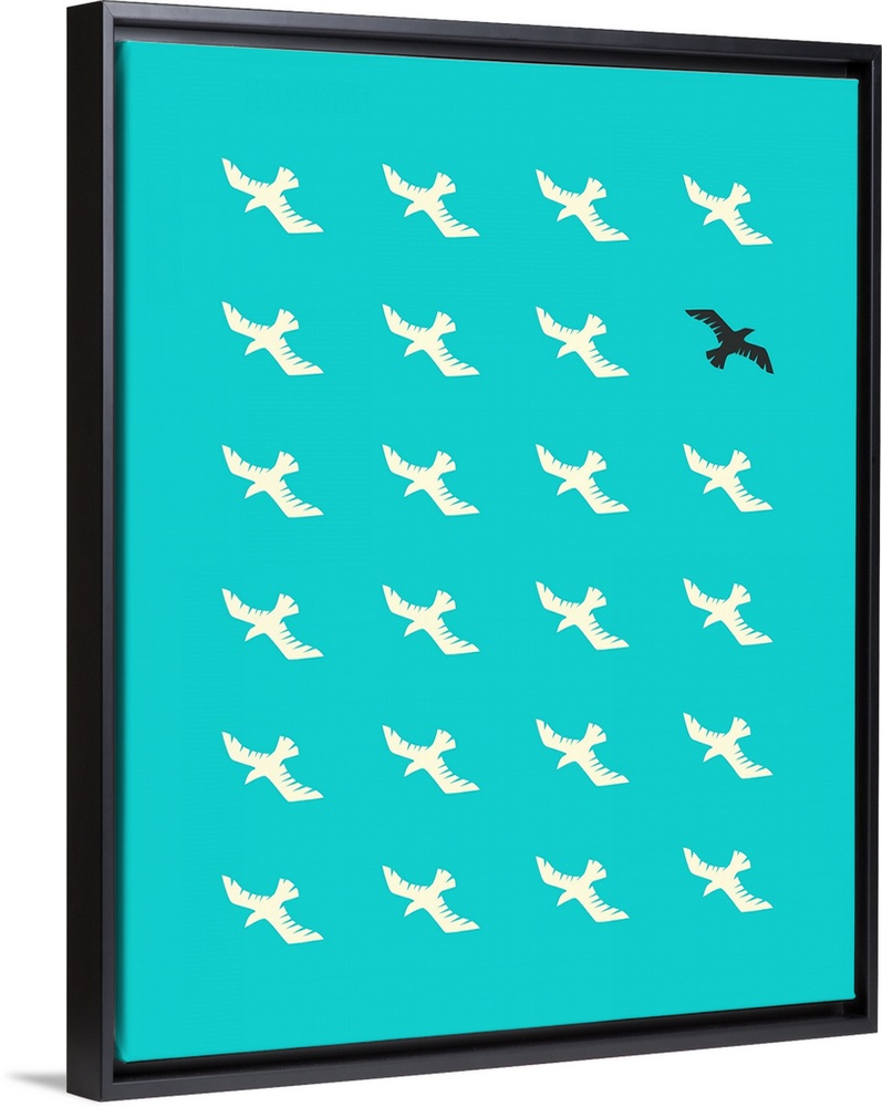 <p>Illustration of a flock of white birds flying down towards the bottom left corner, and one black bird flying up towards the top right corner, on a bright blue background.</p>
