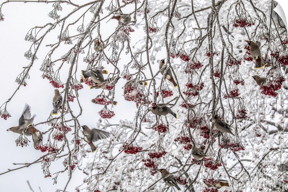 <p>Flock of Bohemian waxwings (Bombycilla garrulus) sitting in a frosty Mountain-ash tree in winter as they feed on the mature berries; Alaska, United States of America</p>