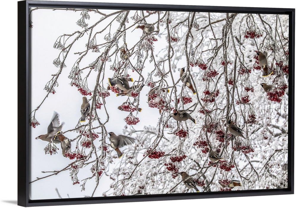 <p>Flock of Bohemian waxwings (Bombycilla garrulus) sitting in a frosty Mountain-ash tree in winter as they feed on the mature berries; Alaska, United States of America</p>
