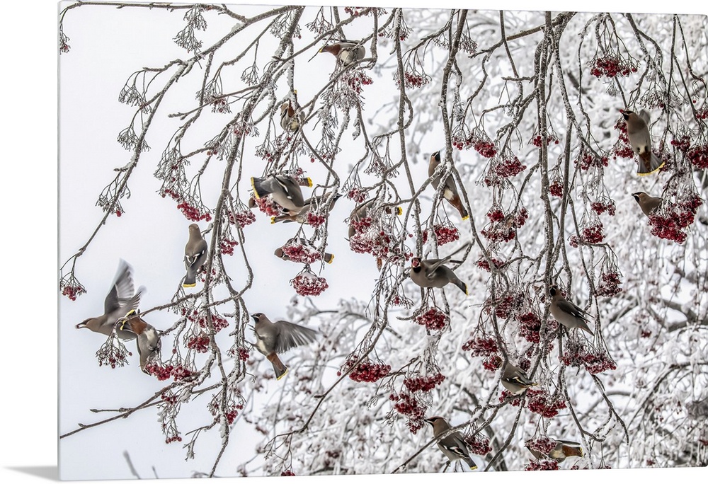 <p>Flock of Bohemian waxwings (Bombycilla garrulus) sitting in a frosty Mountain-ash tree in winter as they feed on the mature berries; Alaska, United States of America</p>