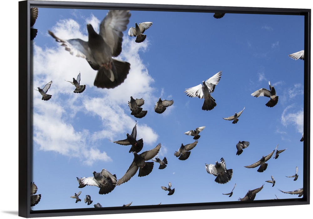 <p>A flock of pigeons taking flight in a blue sky; Ulaanbaatar, Ulaanbattar, Mongolia</p>