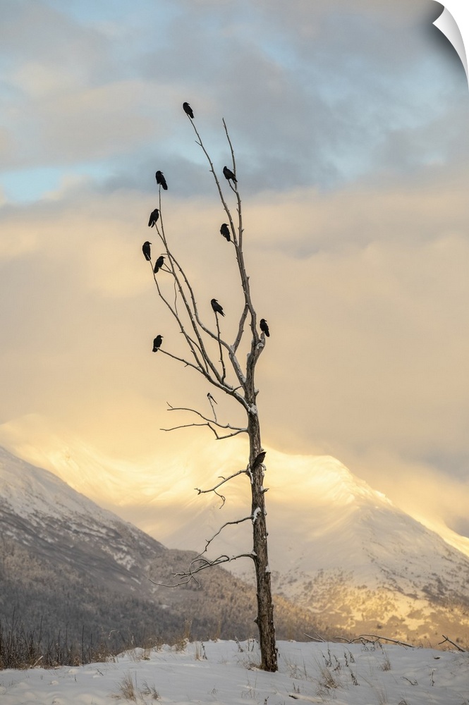 <p>A flock of Ravens perched in an old tree in the Portage Valley at sunrise, South-central Alaska; Alaska, United States of America</p>