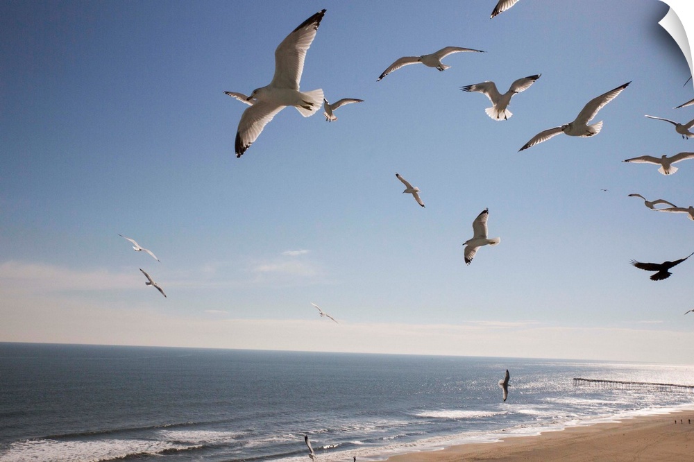 <p>Virginia Beach, Virginia. Flock of Seagulls Fly over a Beach</p>