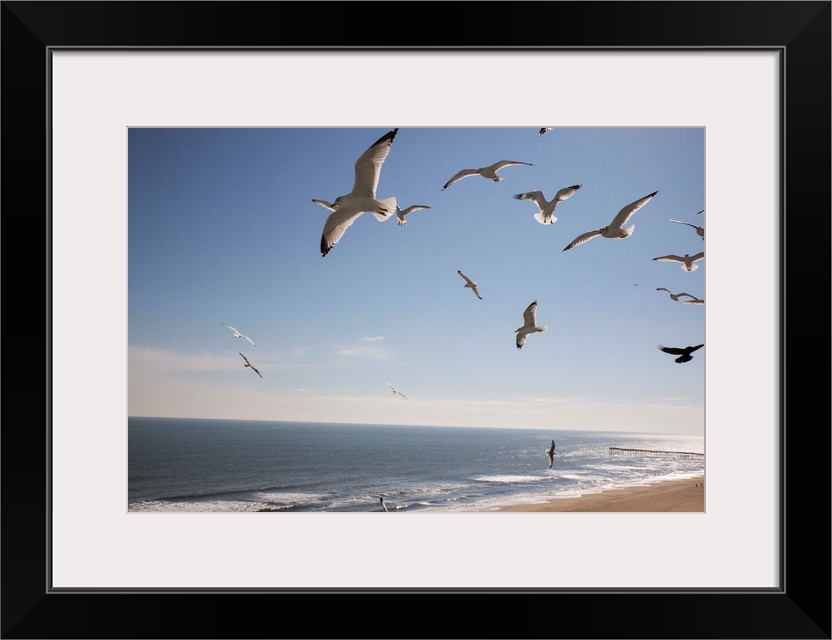 <p>Virginia Beach, Virginia. Flock of Seagulls Fly over a Beach</p>