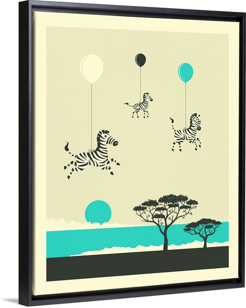 <p>Whimsical illustration of three zebras attached to balloons and floating over the African plains. Created in shades of blue, black, and cream.</p>
