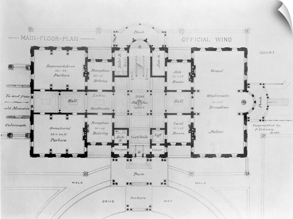 <p>A drawing by F. D. Owen of the main floor plan of the White House.</p>