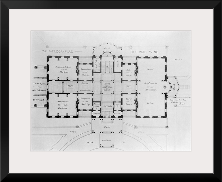 <p>A drawing by F. D. Owen of the main floor plan of the White House.</p>