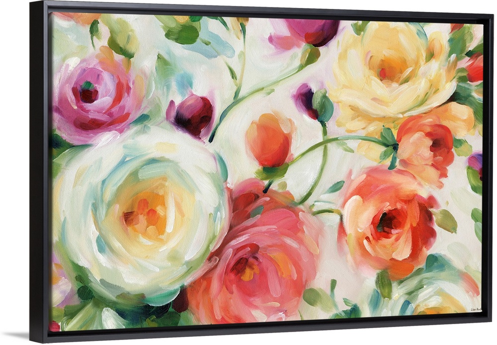 <p>Horizontal contemporary painting of large flower blooms in bold brush strokes.</p>