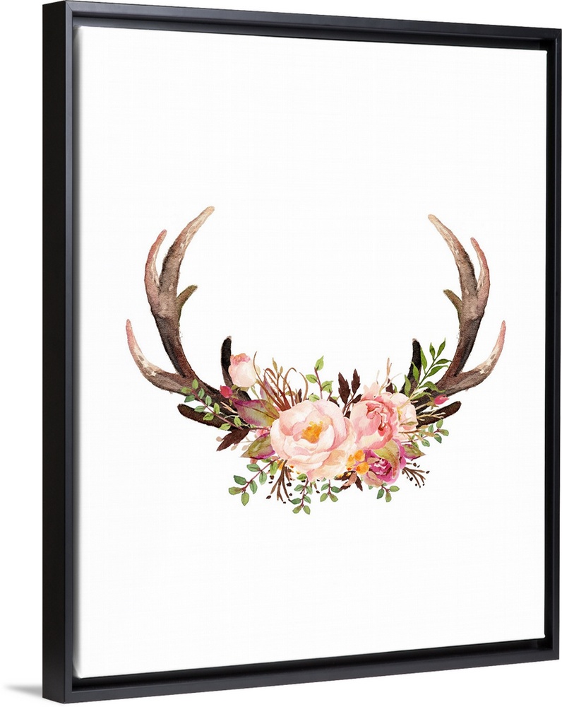 <p>A pair of antlers with an arrangement of watercolor flowers resting in the center.</p>