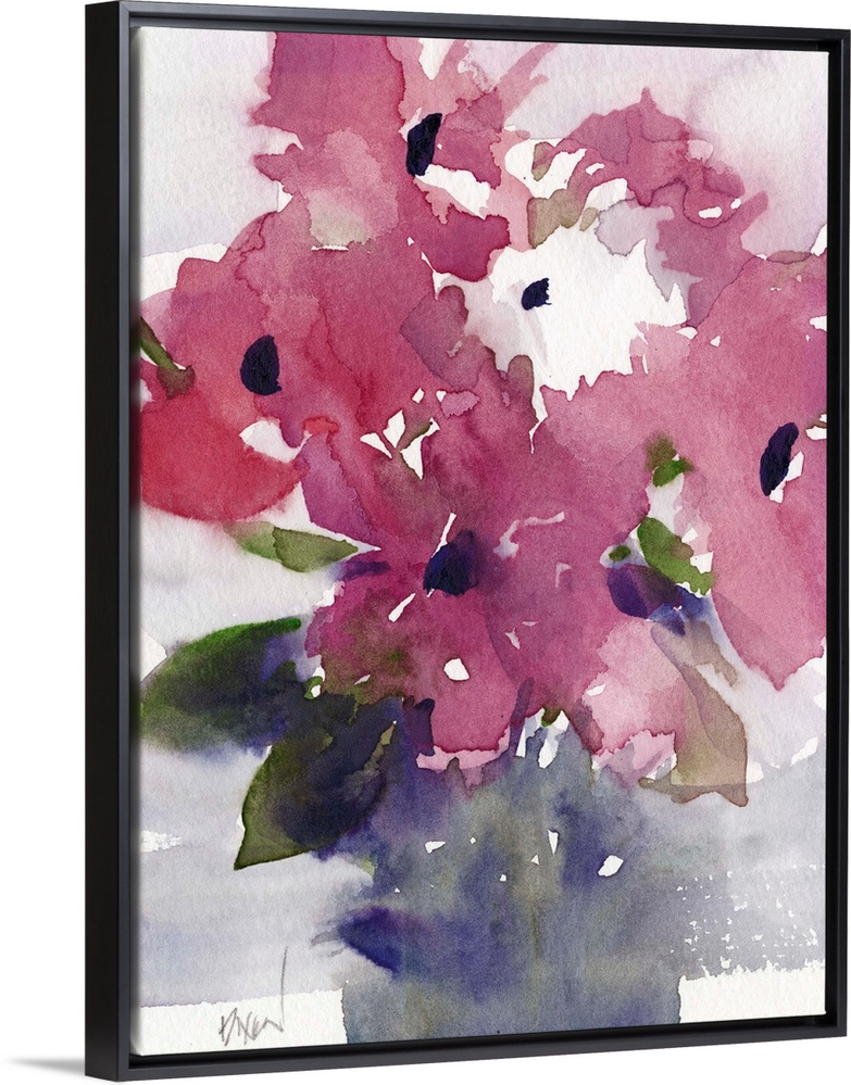 <p>Contemporary watercolor painting of a vase of maroon flowers.</p>